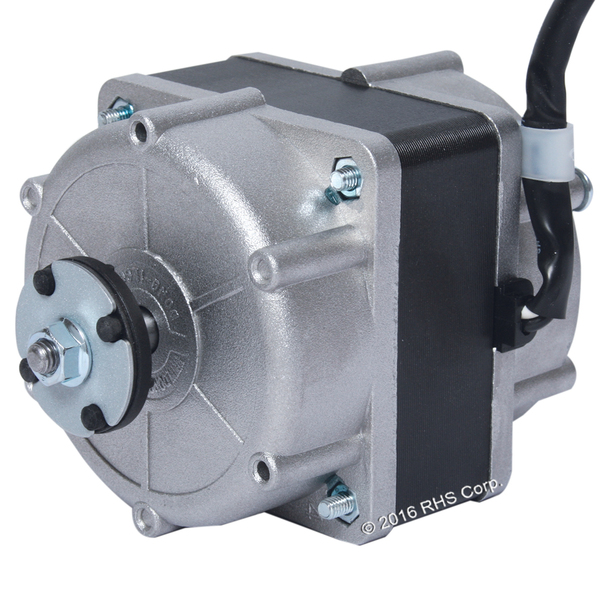 SQUARE HOUSING MOTOR WITH ALUMINUM CAP ON BACK. G.E. HUB WITH 1/4" SHAFT AND NUT ON FRONT 12" LEAD TO PLUG.