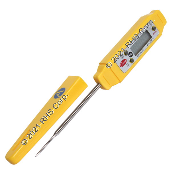 DIGITAL POCKET PROBE THERMOMETER. .25" LCD DISPLAY. TEMP RANGE: -40 TO +392 F (-40 TO +200 C) DUAL RANGE SELECTION. 10 MINUTE AUTOMATIC SHUT-OFF TO PRESERVE 1.5V BATTERY.