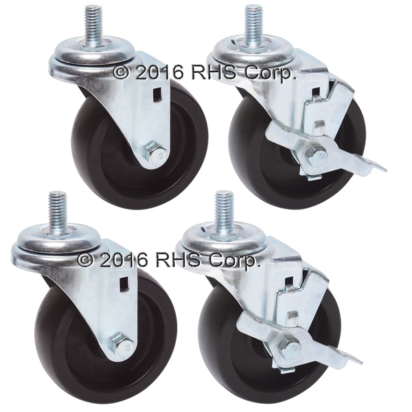 4" WHEEL DIAMETER. 5-1/4" LOAD HEIGHT. 1/2-13 X 1" THREADED STUD. SUPPLIED W/ 3/4" BOX END WRENCH FOR INSTALLATION.